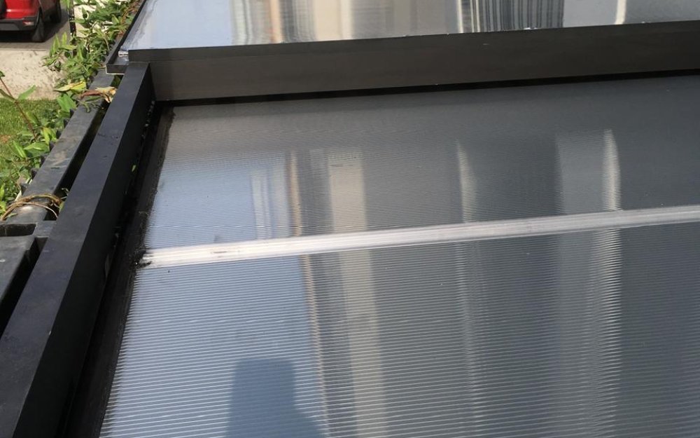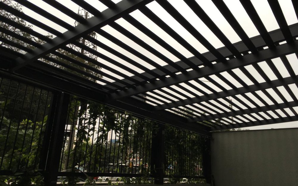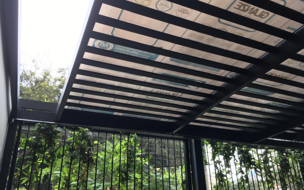TECHO SOL Y SOMBRA DE ALUMINIO NEGRO Y ALUMINIO TACTO MADERA CON COBERTURA DE POLICARBONATO DE 8 MILIMETROS DE ESPESOR.